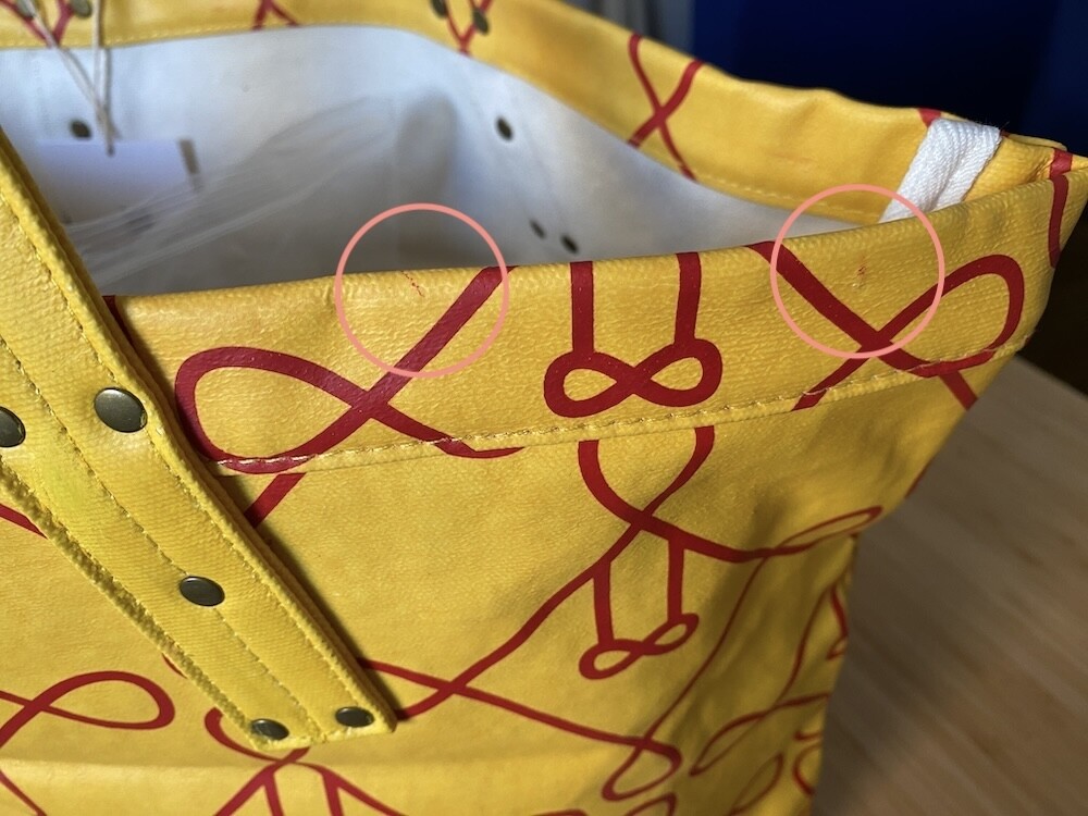 노랑색 바탕에 빨간 프린트가 살짝씩 묻어 있는 부분이 있을 수 있으나 이는 불량이 아닙니다. 이로 인한 교환 및 환불은 불가하니 신중히 고려해 보신 후 구매해 주세요. 아래에 상세 사진으로 남겨 놓을게요.