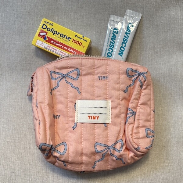 귀여운 리본이 잔뜩 프린트된 파우치예요. 원단 전체에 패딩처럼 아주 얇은 심지가 들어 있고 퀼팅 박음질이 되어 있어서 귀여운 느낌이 더 사는 것 같아요. 안쪽에는 작은 물건들을 따로 넣을 수 있도록 되어 있어서 카드 같은 작은 물건들은 따로 넣을 수도 있어 실용성도 챙겼어요.