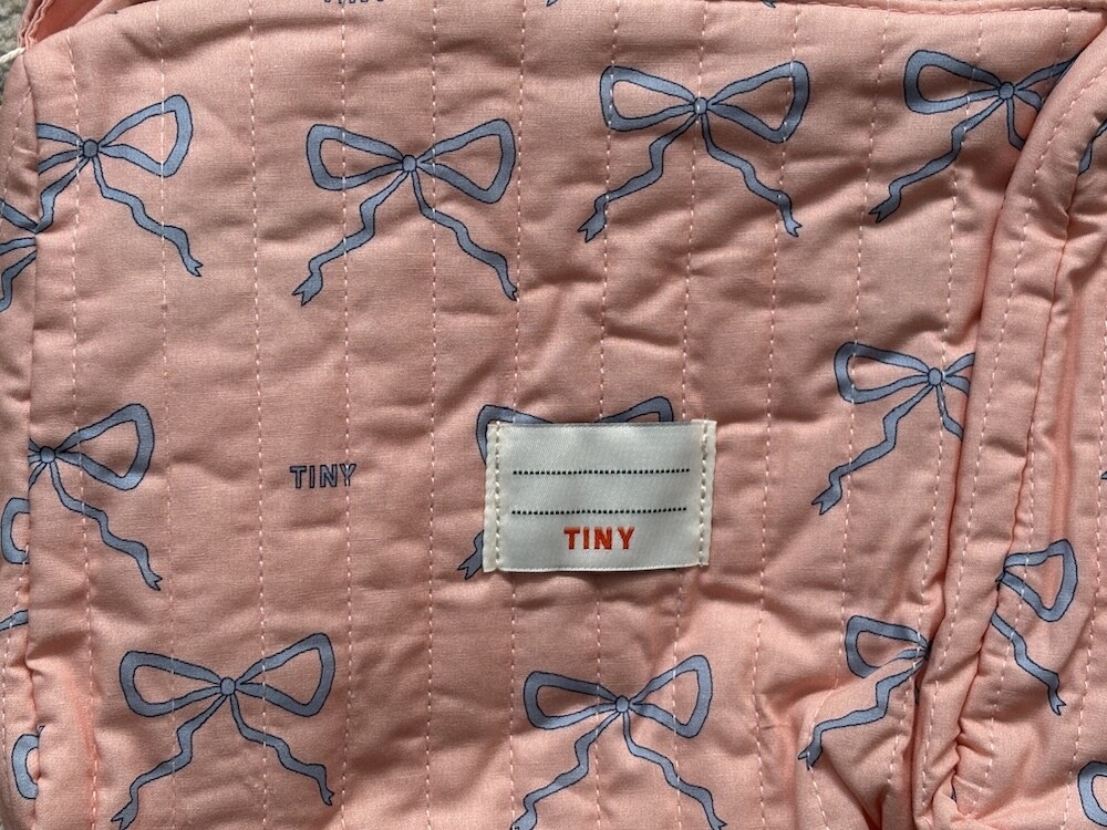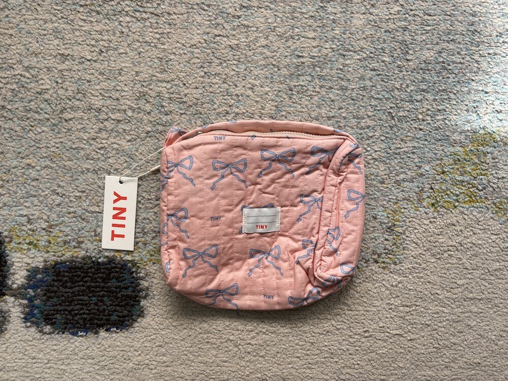 귀여운 리본이 잔뜩 프린트된 파우치예요. 분홍색 바탕과 하늘색의 리본 그림이 잘 어울려서 예쁘고, 원단 전체에 패딩처럼 아주 얇은 심지가 들어 있고 퀼팅 박음질이 되어 있어서 귀여운 느낌이 더 사는 것 같아요. 안쪽에는 작은 주머니가 따로 달려 있어서 카드 같은 작은 물건들은 따로 넣을 수도 있어서 실용성도 좋아요. 평소에 가방 안에 넣어 들고 다니기에도, 여행 다니실 때 물건들을 나눠 담기에도 좋을 거예요. 앞쪽에는 이름을 쓸 수 있는 라벨이 달려 있는데 여기에 이름을 쓰면 아마 더 귀여울 거예요.