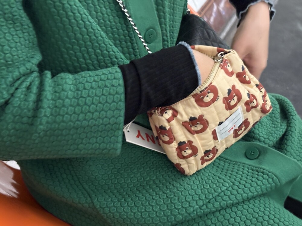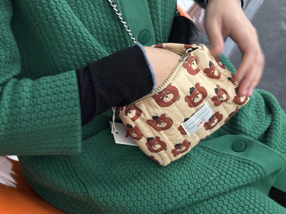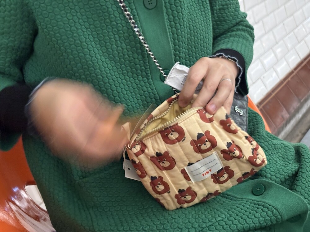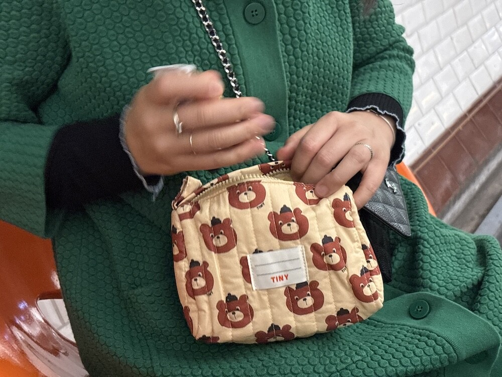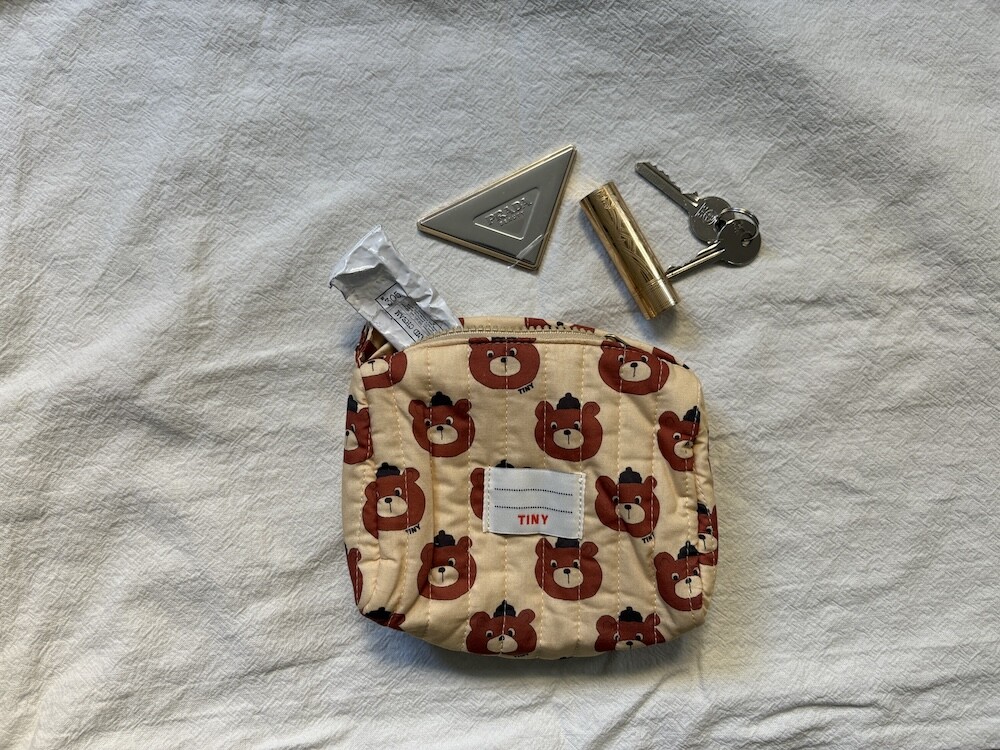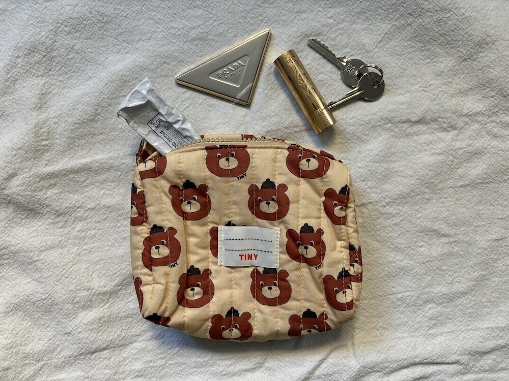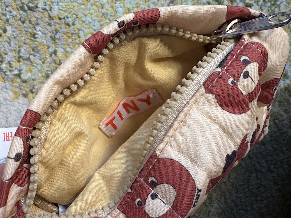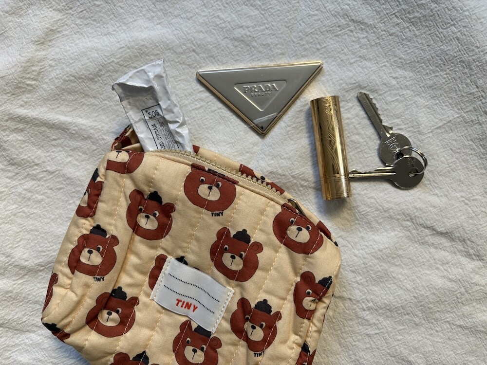 귀여운 곰돌이 얼굴이 잔뜩 프린트된 파우치예요. 원단 전체에 패딩처럼 아주 얇은 심지가 들어 있고 퀼팅 박음질이 되어 있어서 귀여운 느낌이 더 사는 것 같아요. 안쪽에는 작은 물건들을 따로 넣을 수 있도록 되어 있어서 카드 같은 작은 물건들은 따로 넣을 수도 있어 실용성도 챙겼어요.