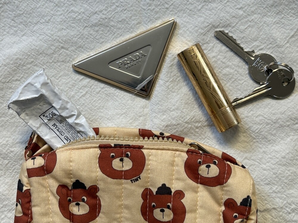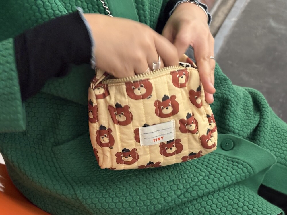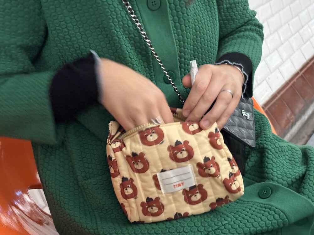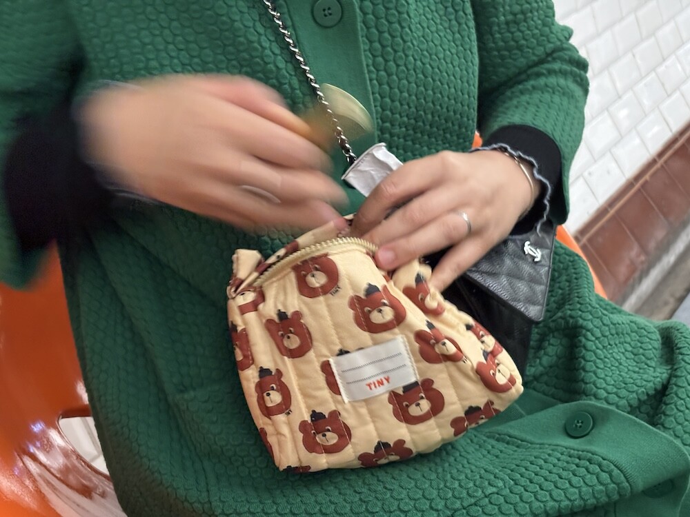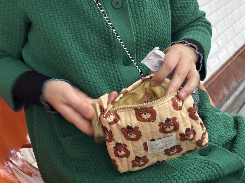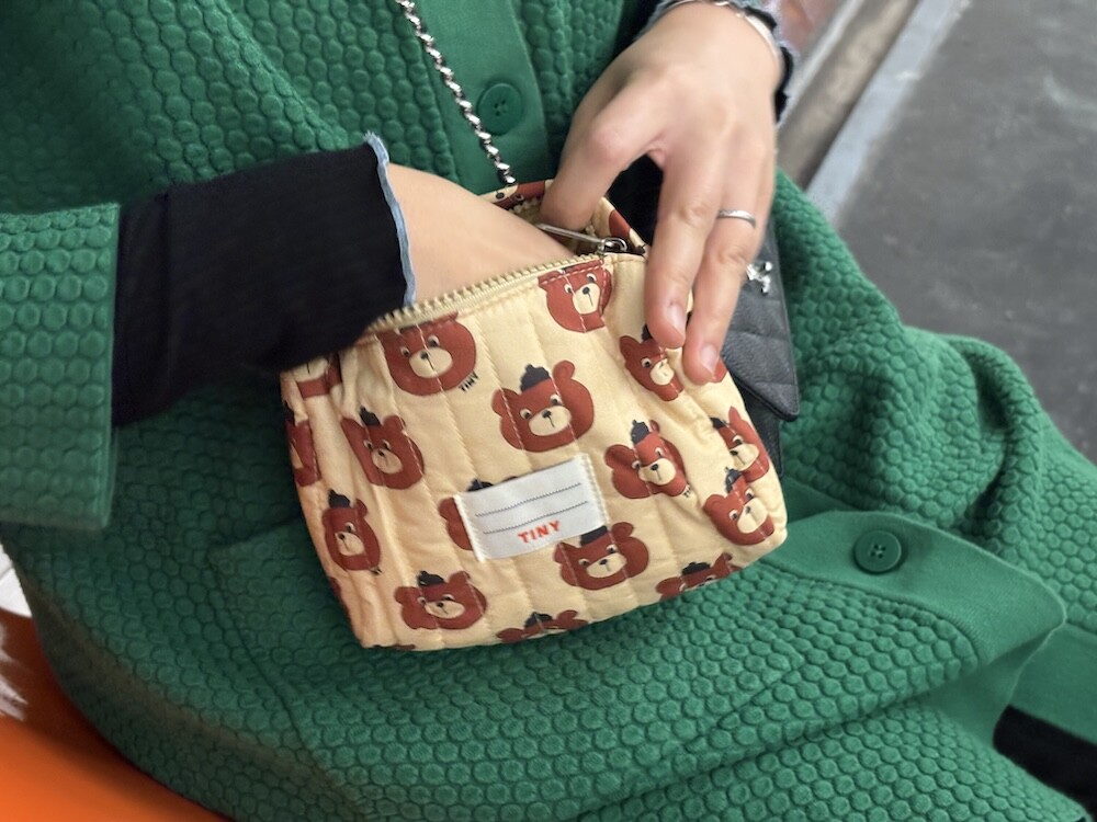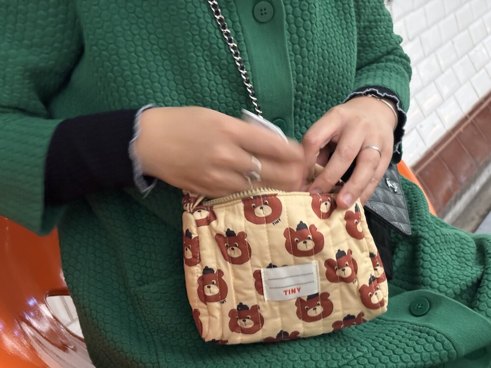 귀여운 곰돌이 얼굴이 잔뜩 프린트된 파우치예요. 원단 전체에 패딩처럼 아주 얇은 심지가 들어 있고 퀼팅 박음질이 되어 있어서 귀여운 느낌이 더 사는 것 같아요. 안쪽에는 작은 물건들을 따로 넣을 수 있도록 되어 있어서 카드 같은 작은 물건들은 따로 넣을 수도 있어 실용성도 챙겼어요.