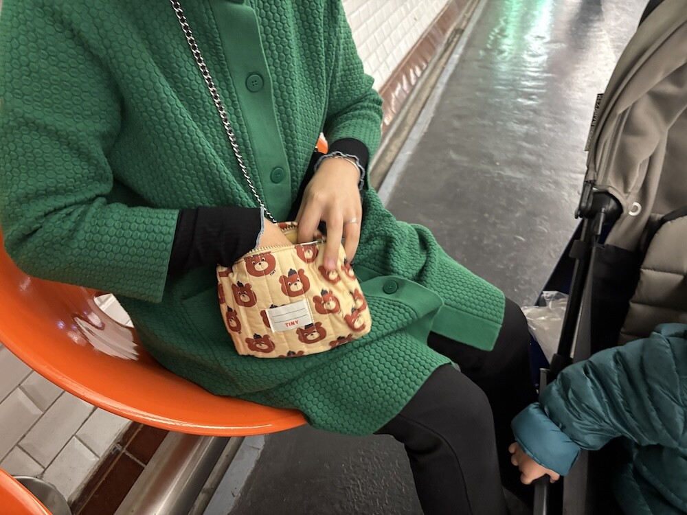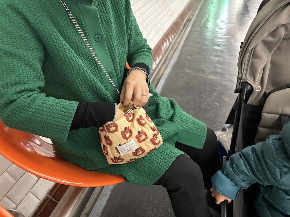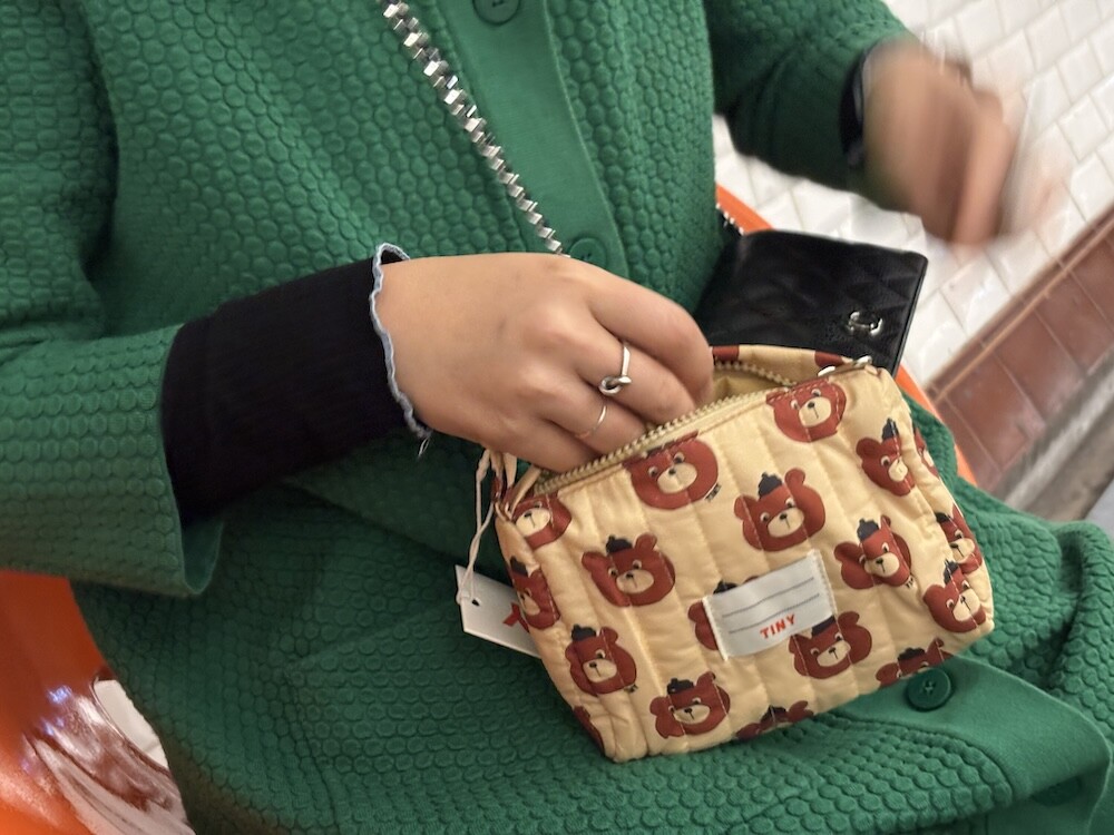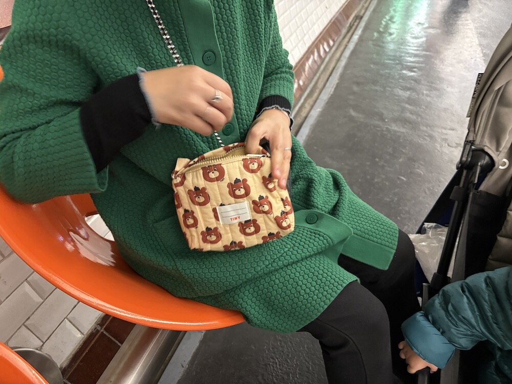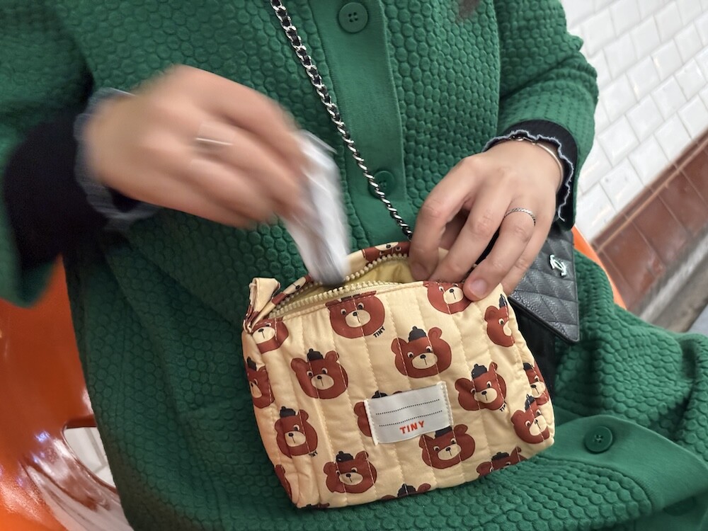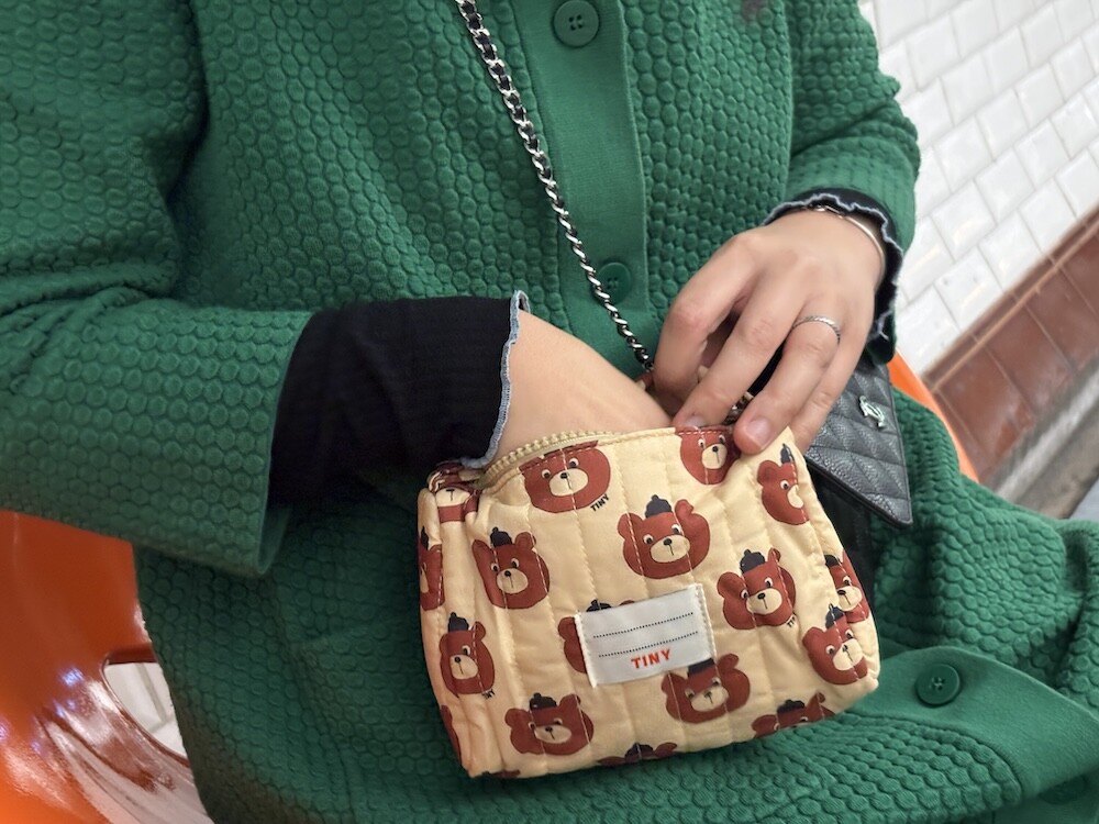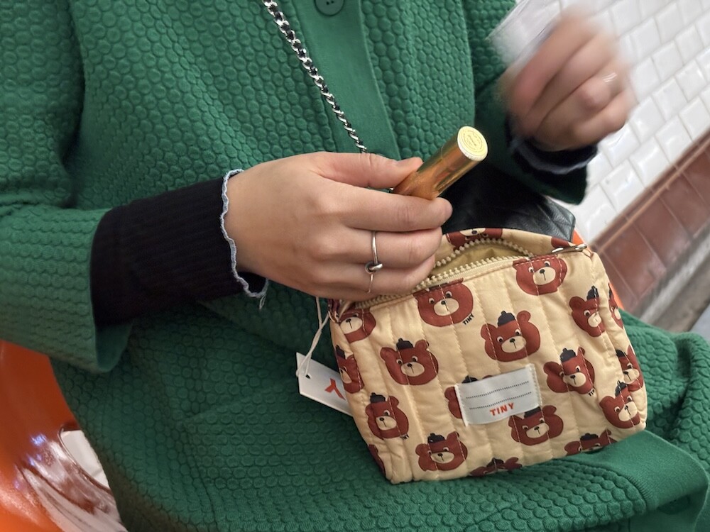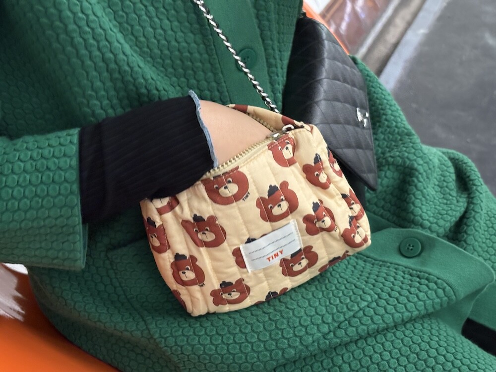 귀여운 곰돌이 얼굴이 잔뜩 프린트된 파우치예요. 원단 전체에 패딩처럼 아주 얇은 심지가 들어 있고 퀼팅 박음질이 되어 있어서 귀여운 느낌이 더 사는 것 같아요. 안쪽에는 작은 물건들을 따로 넣을 수 있도록 되어 있어서 카드 같은 작은 물건들은 따로 넣을 수도 있어 실용성도 챙겼어요.