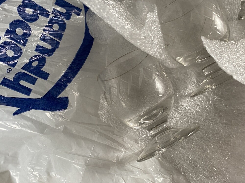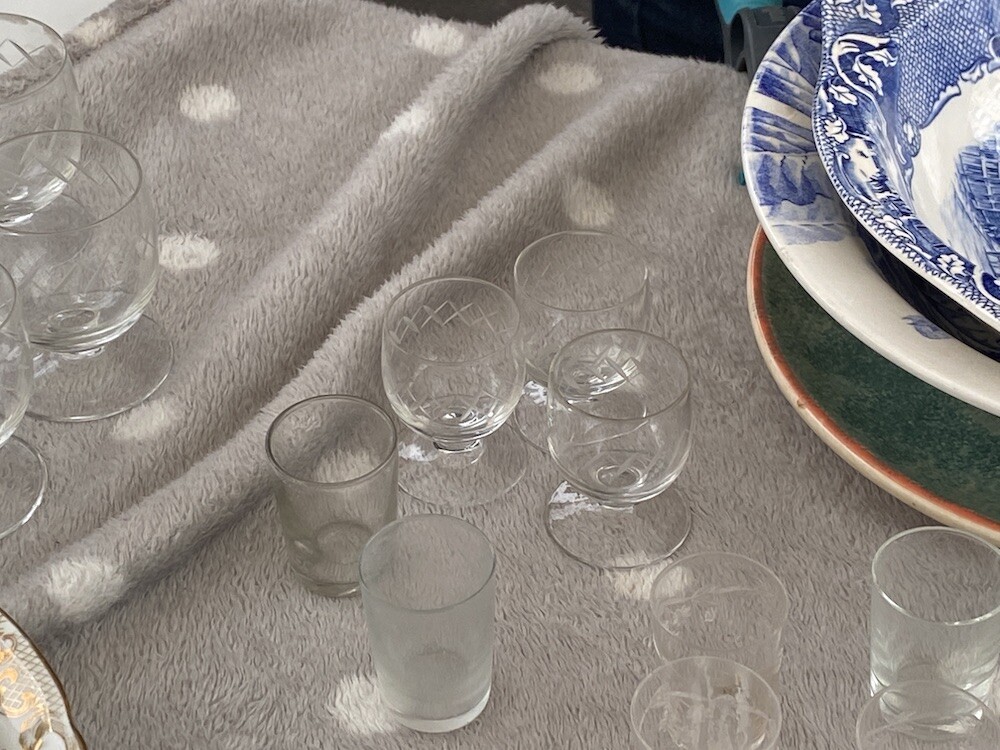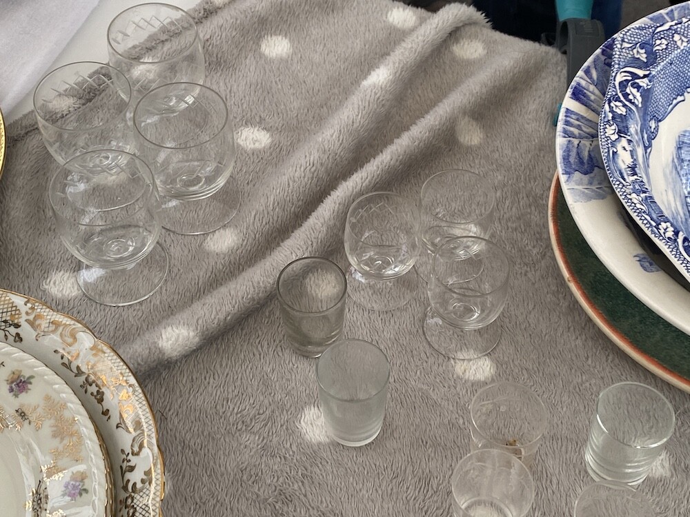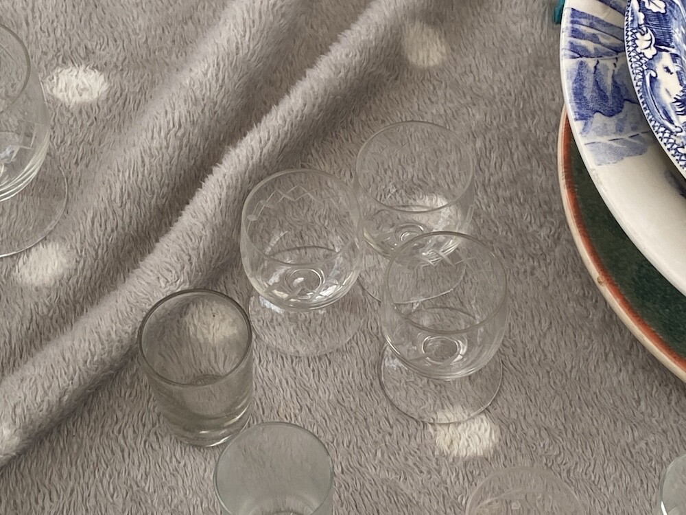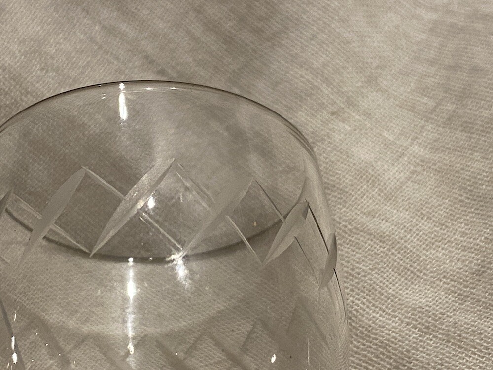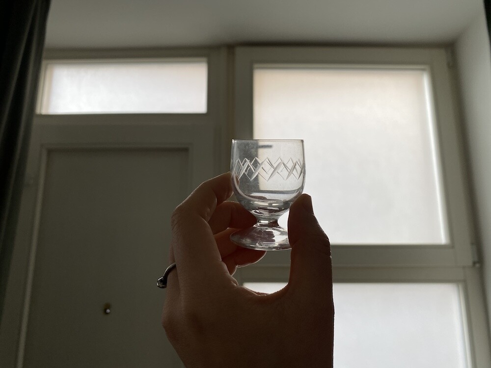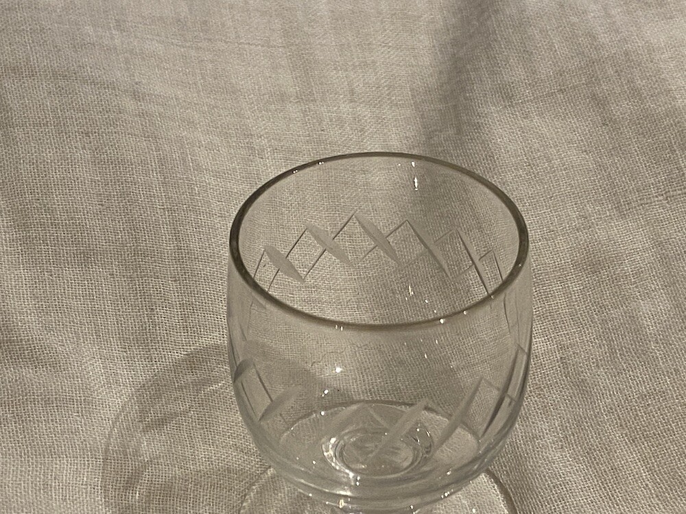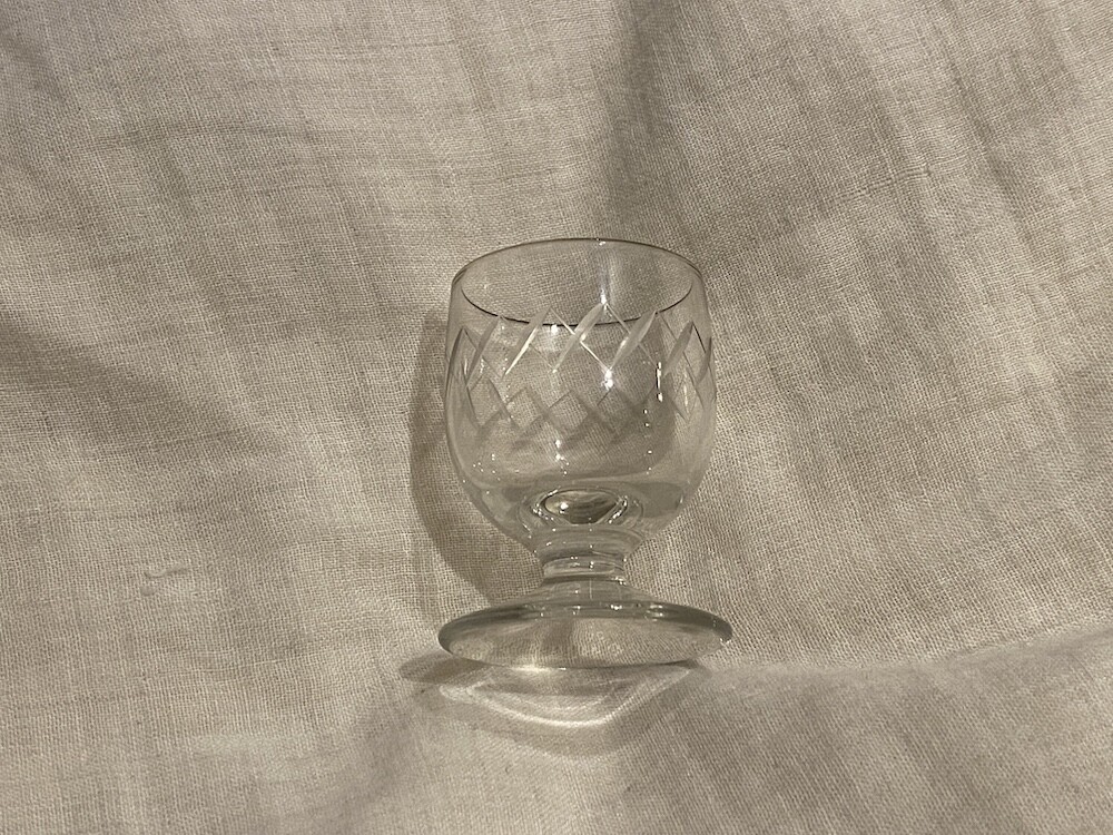 집 앞에서 열린 벼룩시장에서 엄마 아빠 또래의 분들께 구매한 잔이에요. 할머니의 주방에서 꺼내 온 듯한 귀여운 잔으로, 이렇게 작은 사이즈의 술잔은 빈티지 아니면 쉽게 구할 수 없기 때문에 희소성이 있어요. 와인잔 같은 짧은 다리의 받침이 밑에 붙어 있는 귀여운 디자인으로, 몸통 겉에 격자 무늬의 음각이 있어서 예뻐요. 원래는 꼬냑 같은 센 술을 먹을 때 사용하는 잔이라고 말씀하셨는데, 반지나 작은 물건들을 담아 장식용으로 사용하셔도 좋을 것 같아요.