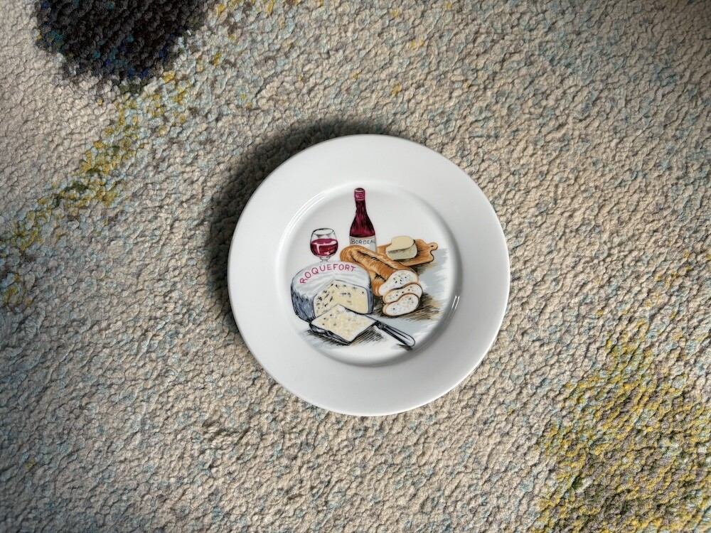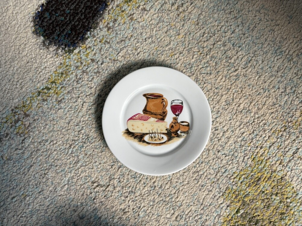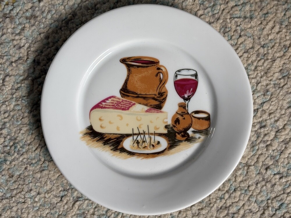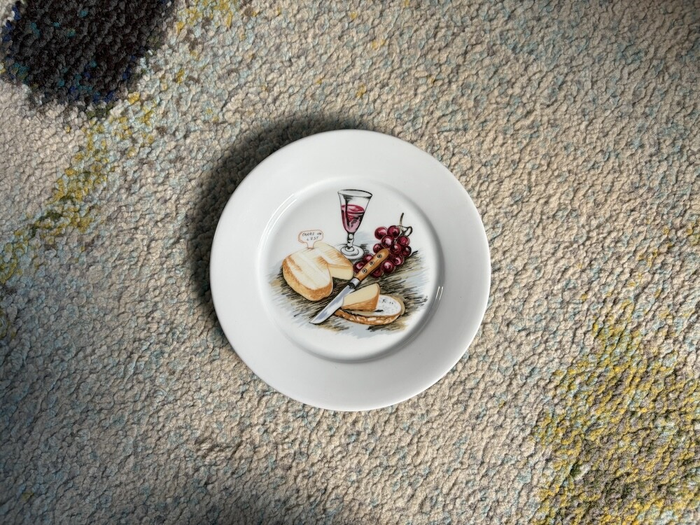 와인과 치즈 그림이 그려진 빈티지 접시입니다.