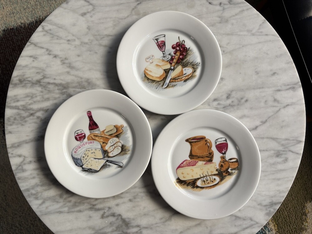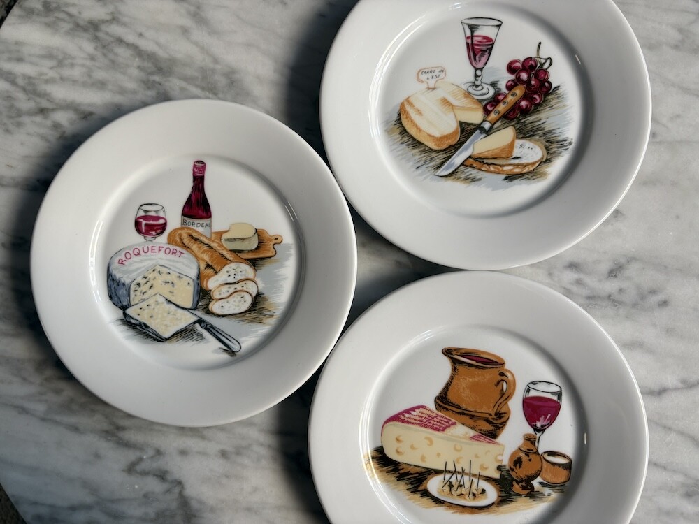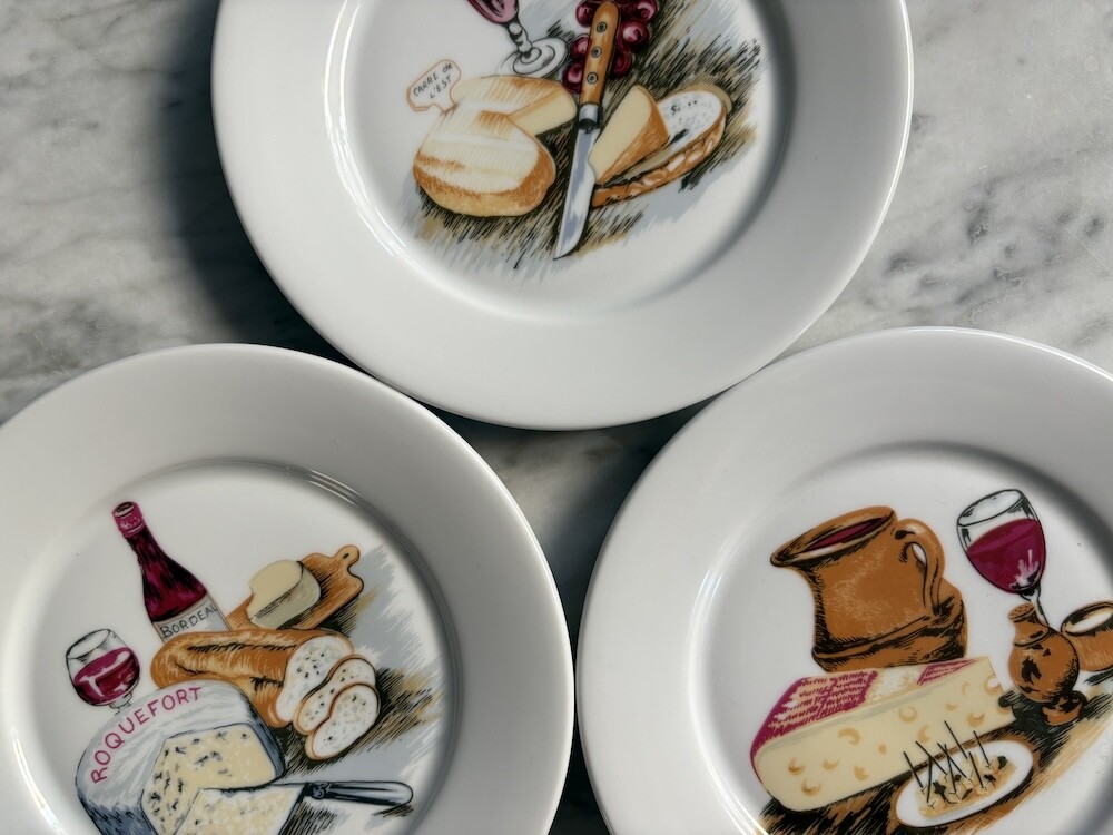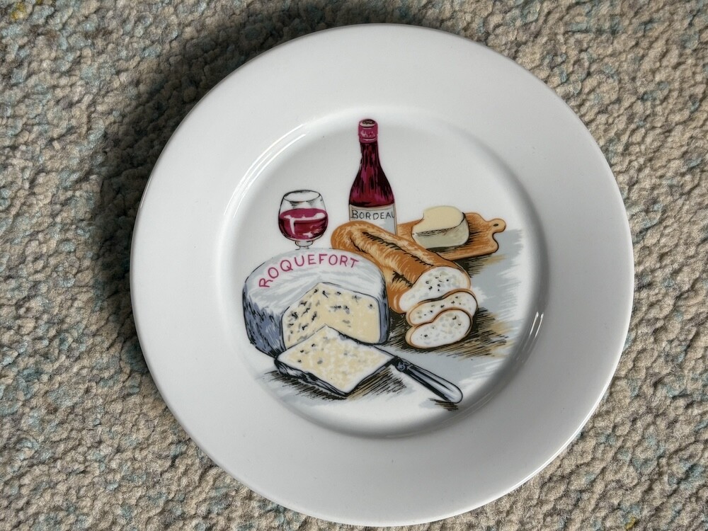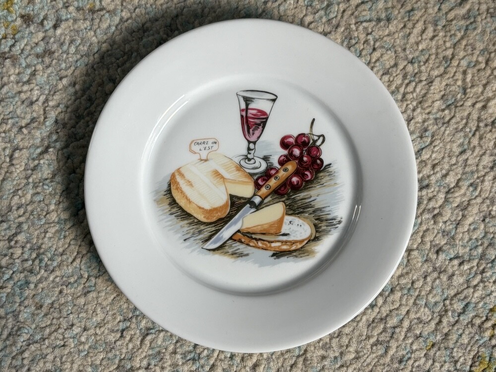 와인과 치즈 그림이 그려진 빈티지 접시입니다.