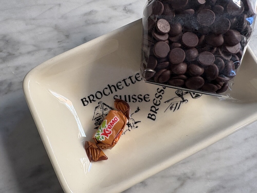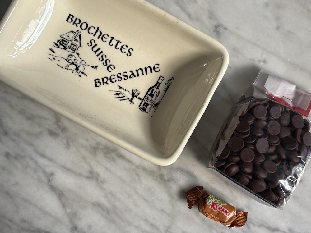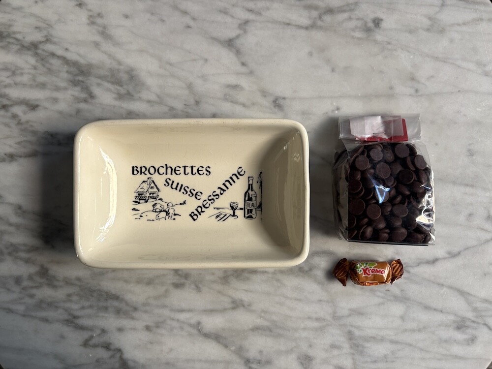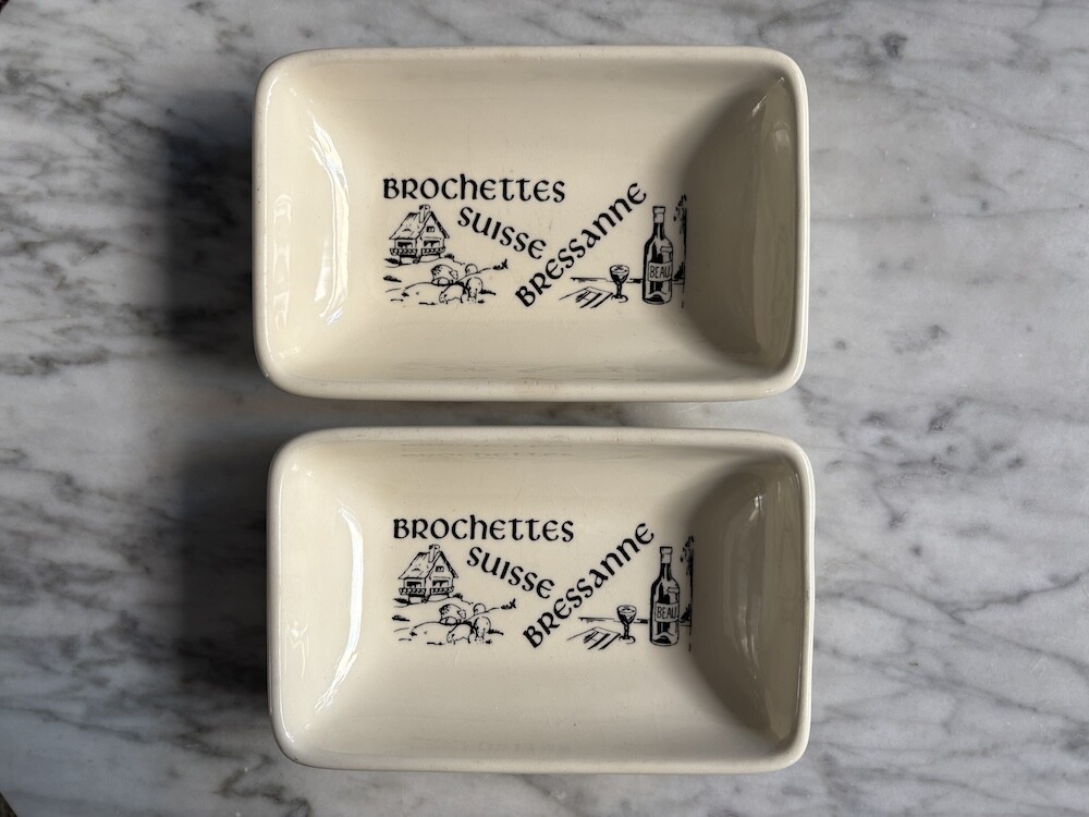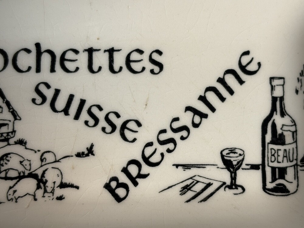깊이가 있는 작은 네모 모양의 볼이에요. 써져 있는 글씨는 프랑스어로, '스위스 브레스 꼬치'라는 뜻입니다. 간식이나 작은 물건들을 담아 두시기 좋을 거예요.