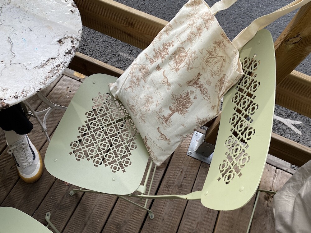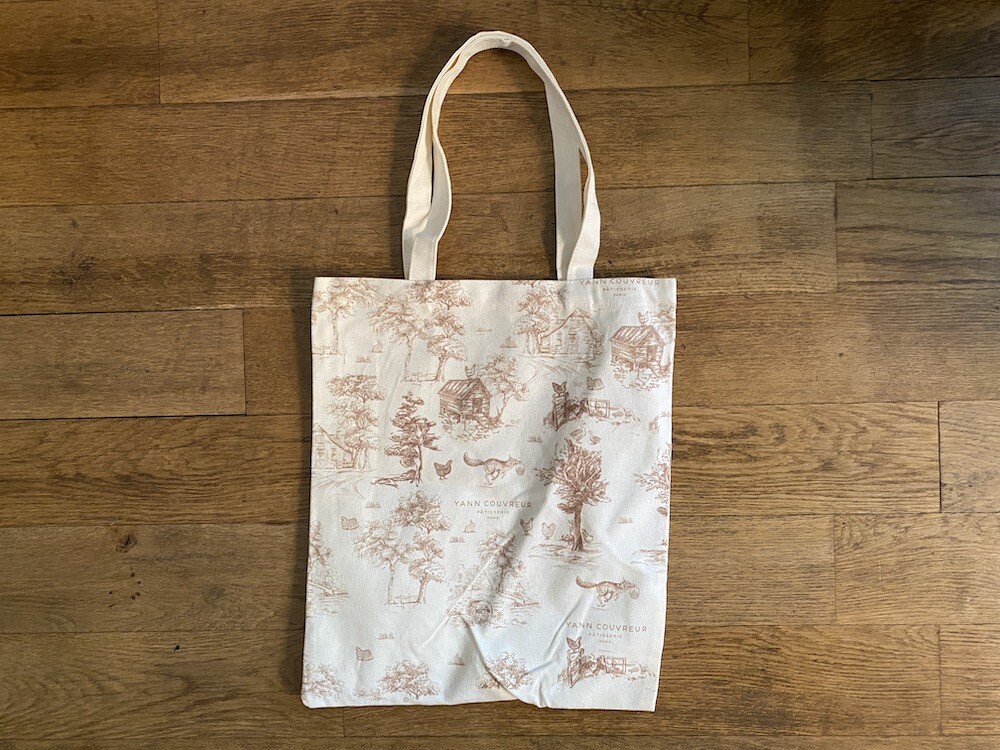 이 에코백에는 시골의 집, 나무 그림과 함께 얀 쿠브레를 상징하는 여우 그림이 함께 그려져 있어요. 중간 중간 얀 쿠브레 빠띠스리 파리 YANN COUVREUR Pâtisserie Paris라고 글씨까지 써져 있어서 더욱 예뻐요.