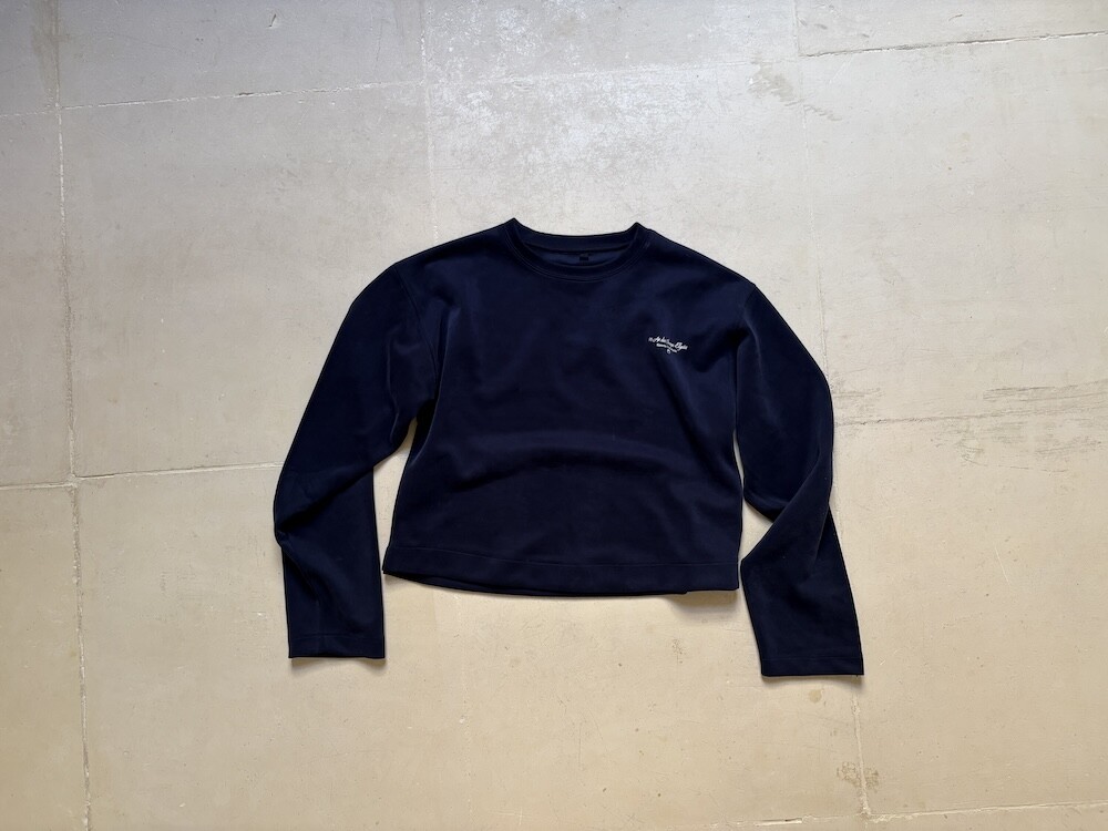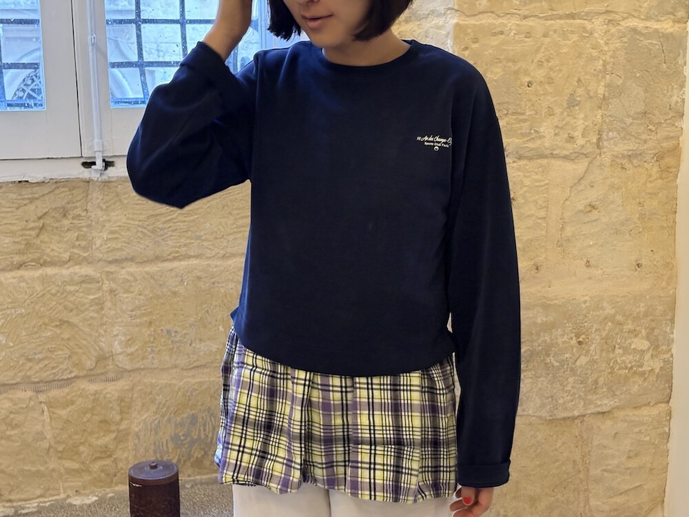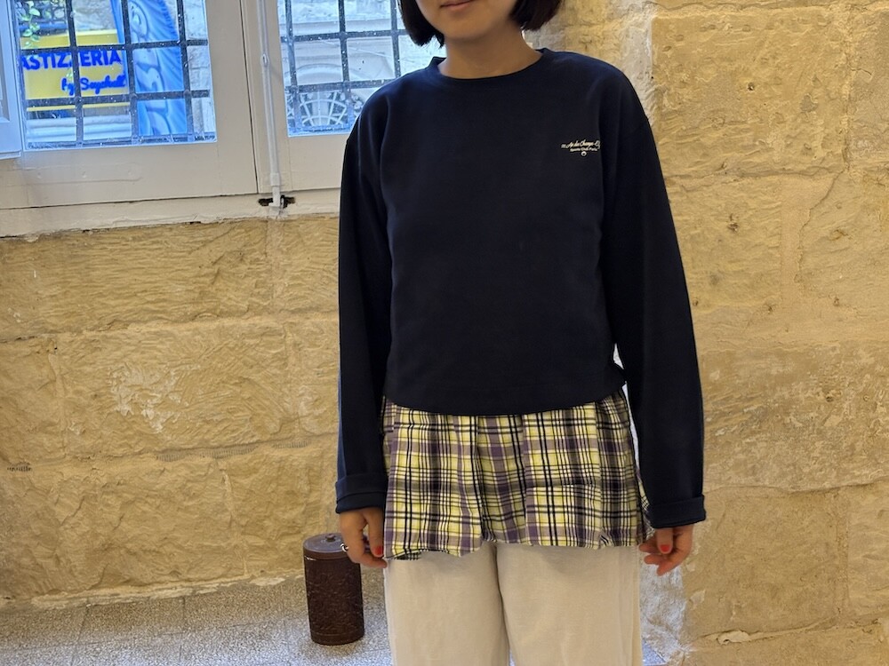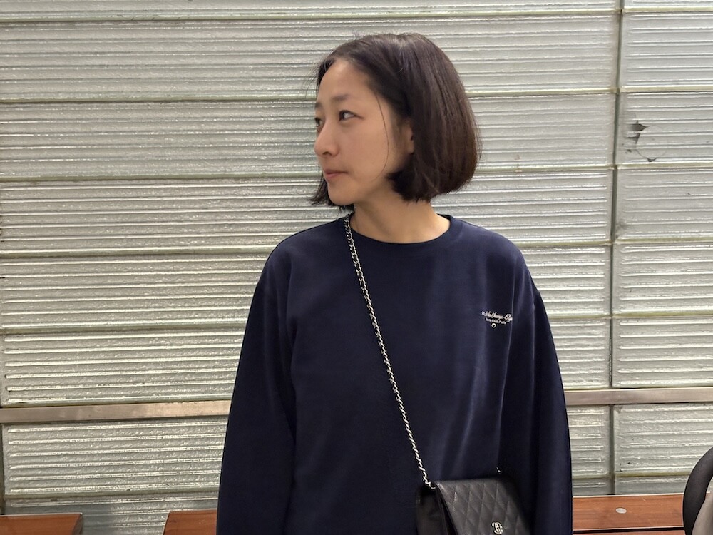 부들부들한 원단의 맨투맨이에요. 사실 목 부분은 맨투맨 디자인인데 소매 끝과 밑단은 일반 티셔츠처럼 되어 있어서 오히려 원피스에 겹쳐 입거나 할 때 조이는 부분이 없어서 편해요. 넉넉한 사이즈로, 단독으로 입어도 원피스나 티셔츠와 함께 레이어드해 입어도 예쁘고요. 무엇보다 원단이 너무 부드러워서 얼굴을 계속 대고 싶을 정도예요. 저는 요즘 이 티셔츠를 침대에 놓고 자다가 추우면 입거든요. 잠옷으로 입어도 될 정도로 부드러운 감촉이 너무 좋더라고요. 또, 원단 자체가 코듀로이는 아닌데 코듀로이처럼 직조감이 보여서 심심하지 않고 예뻐요.