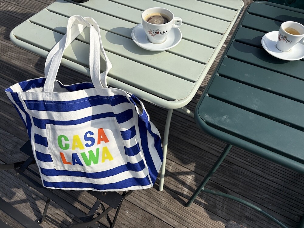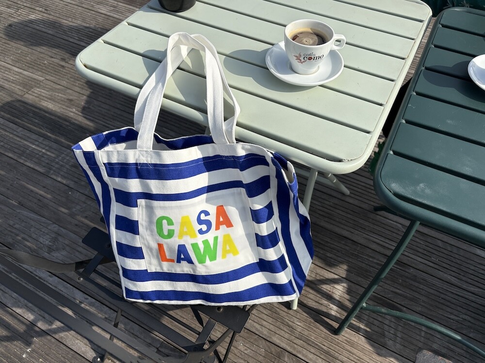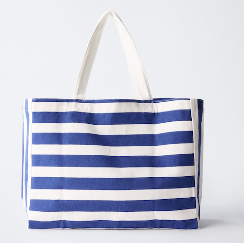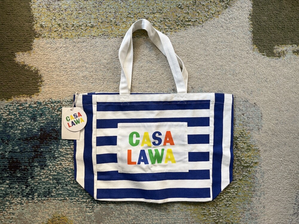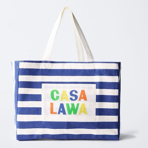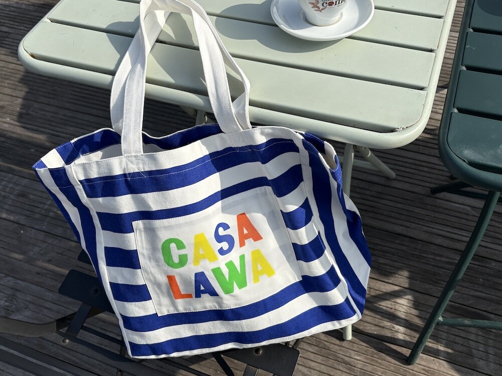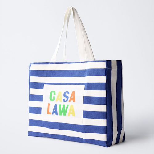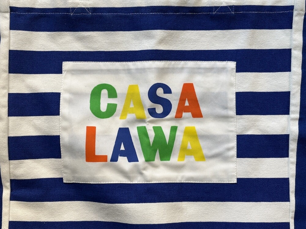파란색 줄무늬에 까사 라와(CASA LAWA) 로고 라벨이 크게 박음질된 가방입니다. 가방 디자인만 봐도 눈부신 시칠리아의 풍경이 펼쳐지는 것 같은 느낌이에요. 어느 계절에나 예쁘겠지만 특히 한여름에 메면 엄청 예쁠 에코백입니다.